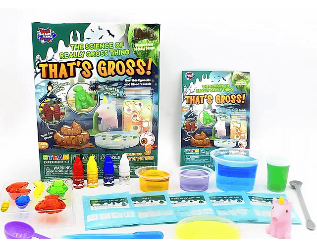 ¡La ciencia nunca fue tan pegajosa, viscosa y divertida! Con el set de experimentos “That’s Gross!”, los niños podrán convertirse en pequeños cientĂficos locos mientras crean mezclas que parecen sacadas de una pelĂcula de monstruos: mocos de unicornio, ojos espeluznantes, vasos sanguĂneos falsos, babas viscosas y mucho más.